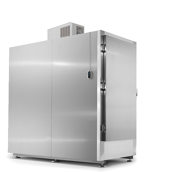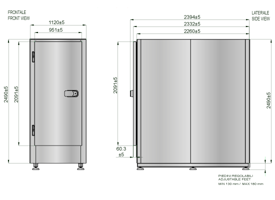La cella poggia su una struttura in tubolare di acciaio Inox AISI304, completa di nr. 6 piedini antivibranti, diametro 140 mm, regolabili in altezza (130/180 H mm) per permettere il passaggio delle tubazioni di scarico.
