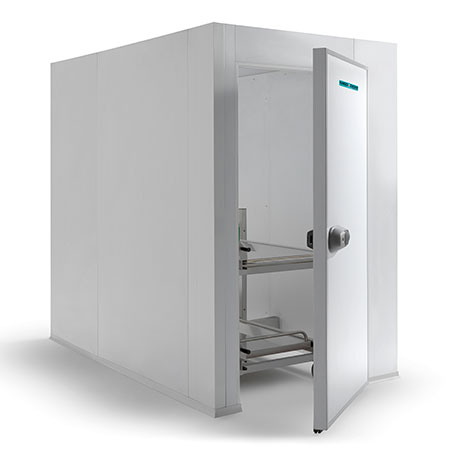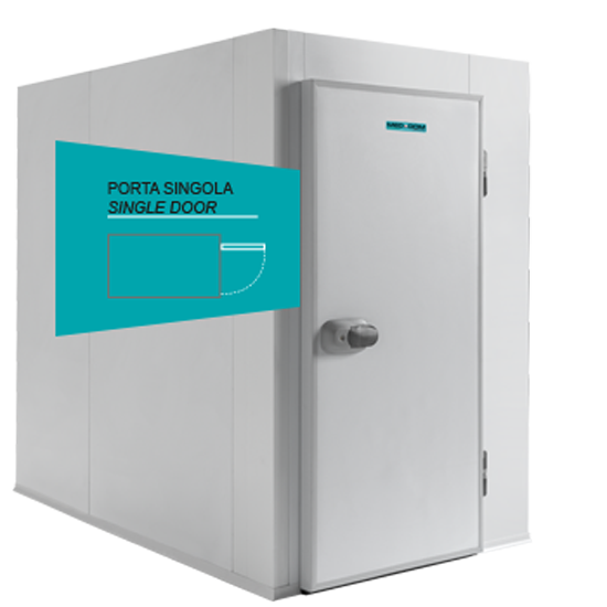 Cella spessore 70 mm, con rivestimento in lamiera preverniciata bianca, senza pavimento, completa di batticarrello in acciaio inox 40x40 mm.
