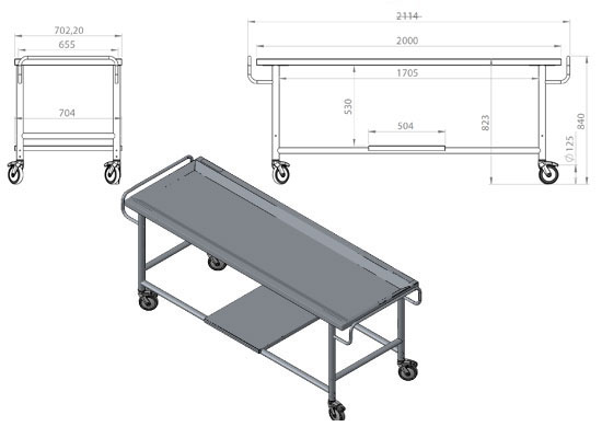 Il carrello porta salme è utilizzato per il trasporto nel reparto ospedaliero sino alla sala mortuaria;
